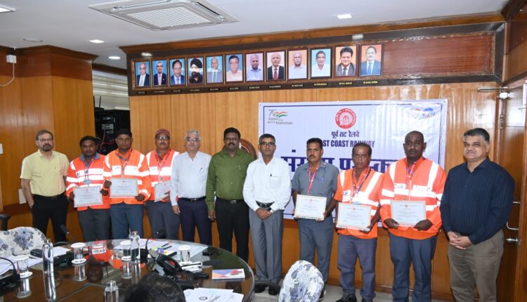 ଭୁବନେଶ୍ୱର, ୨୫ ଅଗଷ୍ଟ ୨୦୨୫ : ଉତ୍ସର୍ଗୀକୃତ ସେବା ଏବଂ ସତର୍କତାକୁ ସ୍ୱୀକୃତି ଦେଇ ଏକ ପ୍ରଶଂସନୀୟ ପଦକ୍ଷେପ ସ୍ୱରୂପ ପୂର୍ବତଟ ରେଳପଥ ମହାପ୍ରବନ୍ଧକ ଶ୍ରୀ ପରମେଶ୍ୱର ଫୁଙ୍କୱାଲ ଟ୍ରେନ ପରିଚାଳନାର ନିରାପତ୍ତା ଏବଂ ଦକ୍ଷତା ସୁନିଶ୍ଚିତ କରିବାରେ ଉଲ୍ଲେଖନୀୟ କାର୍ଯ୍ୟଦକ୍ଷତା ଏବଂ ସତର୍କତା ପାଇଁ ଛଅ ଜଣ ରେଳ କର୍ମଚାରୀଙ୍କୁ ସମ୍ମାନିତ କରିଛନ୍ତି |
