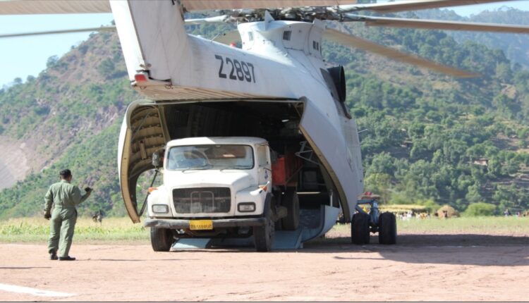 ପ୍ରକଳ୍ପର ସବୁଠାରୁ ଦୂରବର୍ତ୍ତୀ ଅଂଶ, ଅର୍ଥାତ୍ ସାୱାଲକୋଟ ପର୍ଯ୍ୟନ୍ତ ଆପ୍ରୋଚ୍ ରାସ୍ତା ନିର୍ମାଣର ଅଗ୍ରଗତିକୁ ତ୍ୱରାନ୍ୱିତ କରିବା ଉଦ୍ଦେଶ୍ୟରେ, ଜମ୍ମୁ ବିମାନବନ୍ଦରରୁ ସେନା ହେଲିକପ୍ଟର ବ୍ୟବହାର କରି ଭାରୀ ନିର୍ମାଣ ମେସିନଗୁଡ଼ିକର ବିମାନ ପରିବହନ କରାଯାଇଥିଲା। କେବଳ ହାତ ଉପକରଣ ବ୍ୟବହାର କରି ଦୁଗ୍ଗା ଏବଂ ସାୱାଲକୋଟ ମଧ୍ୟରେ ସୁରୁକୋଟ ଗ୍ରାମ ନିକଟରେ 100 ମିଟର x 40 ମିଟର ଜମିକୁ ସମତଳ କରି ଏକ ଟେବୁଲ ଟପ୍ ହେଲିପ୍ୟାଡ୍ ନିର୍ମାଣ କରାଯାଇଥିଲା। ଭାରୀ ନିର୍ମାଣ ଯନ୍ତ୍ରର ହେଲି ଉଠାଇବା ପାଇଁ MI-26 ହେଲିକପ୍ଟର ବ୍ୟବହାର କରାଯାଇଥିଲା, ସର୍ଟ କରାଯାଇଥିଲା ଏବଂ 226 MT ଭାର ସୁରୁକୋଟକୁ ନିଆଯାଇଥିଲା (ଫଟୋ ଆବଦ୍ଧ) |