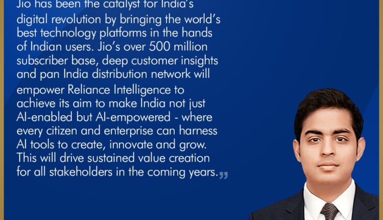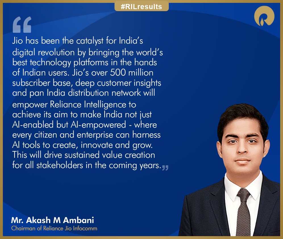 ରିଲାଏନ୍ସ ଜିଓ ଇନଫୋକମର ଅଧ୍ୟକ୍ଷ ଆକାଶ ଏମ୍ ଅମ୍ବାନୀ କହିଛନ୍ତି, “ଜିଓ ଭାରତୀୟ ଉପଭୋକ୍ତାଙ୍କ ପାଖରେ ବିଶ୍ୱର ସର୍ବୋତ୍ତମ ପ୍ରଯୁକ୍ତି ପ୍ଲାଟଫର୍ମ ଉପଲବ୍ଧ କରାଇବା ସହିତ ଭାରତର ଡିଜିଟାଲ୍ କ୍ରାନ୍ତିର ବାହକ ହୋଇଛି। ଜିଓର ୫୦ କୋଟିରୁ ଅଧିକ ଗ୍ରାହକ ସଂଖ୍ୟା, ଗ୍ରାହକକୈନ୍ଦ୍ରିକ ସେବା ଅଏବଂ ସାରା ଦେଶରେ ବିସ୍ତୃତ ନେଟୱାର୍କ ରିଲାଏନ୍ସ ଇଣ୍ଟେଲିଜେନ୍ସକୁ ଭାରତକୁ ଏଆଇ-ସକ୍ଷମ ସହିତ ଏଆଇ-ସଶକ୍ତ କରିବା ପାଇଁ ଏହାର ଲକ୍ଷ୍ୟ ହାସଲ ଦିଗରେ ସହାୟକ ହେବ, ଯାହା ଦ୍ୱାରା ପ୍ରତ୍ୟେକ ନାଗରିକ ଏବଂ ଉଦ୍ୟୋଗ ଏଆଇ ଉପକରଣ (ଟୁଲସ) ଜରିଆରେ ନୂତନ ସୃଷ୍ଟି, ନବସୃଜନ ଏବଂ ଅଭିବୃଦ୍ଧି ହାସଲ କରିପାରିବେ। ଏହା ଆଗାମୀ ବର୍ଷଗୁଡ଼ିକରେ ସମସ୍ତ ସେୟାରହୋଲଡ଼ରମାନଙ୍କ ପାଇଁ ଦୀର୍ଘକାଳୀନ ମୂଲ୍ୟ ସୃଷ୍ଟିକୁ ତ୍ୱରାନ୍ୱିତ କରିବ।”