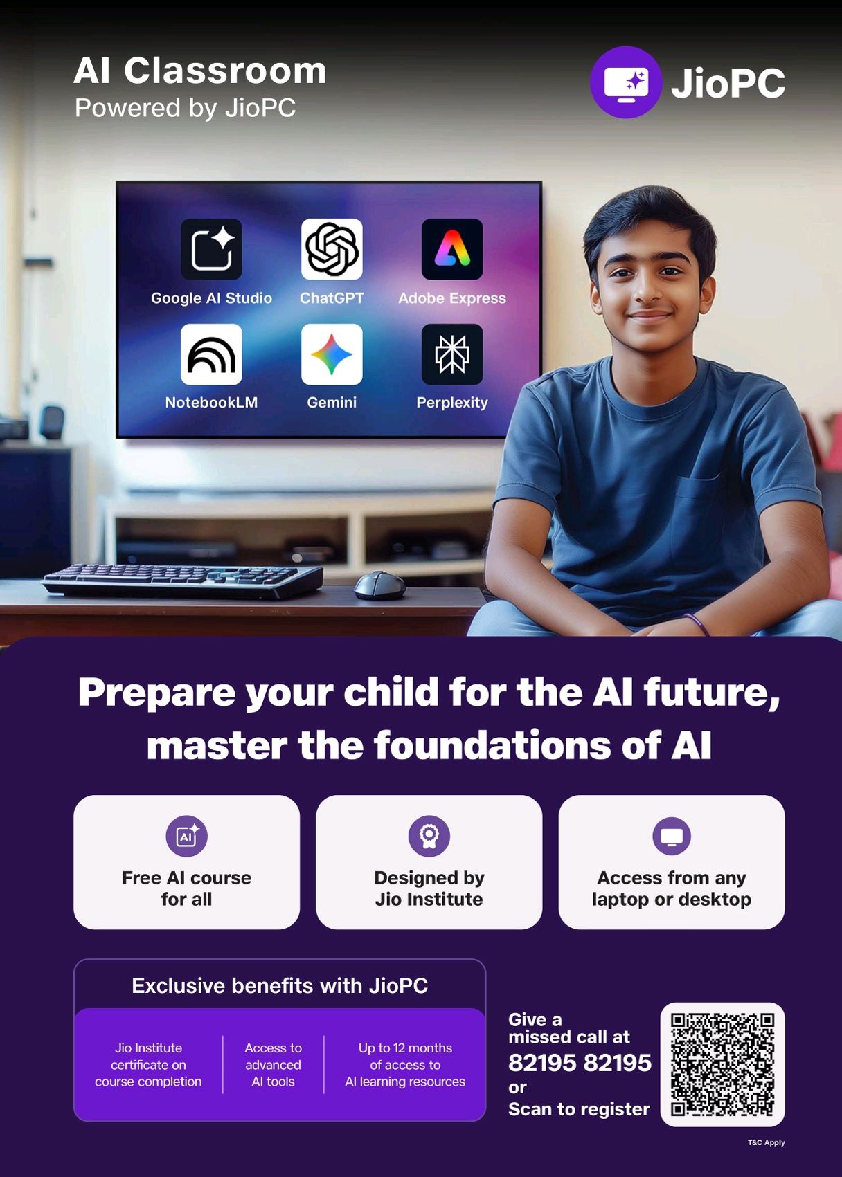 କମ୍ପାନୀ ଅନୁଯାୟୀ, ଭାରତକୁ କୃତ୍ରିମ ବୁଦ୍ଧିମତ୍ତା କ୍ଷେତ୍ରରେ ଏକ ସୁପରପାୱାର କରିବା ମିଶନକୁ ଆଗକୁ ବଢ଼ାଇବା ପାଇଁ ଜିଓ ପିସି ଏବଂ ଜିଓ ଇନଷ୍ଟିଚ୍ୟୁଟ୍ ଏଆଇ କ୍ଲାସରୁମ୍ ଆରମ୍ଭ କରିଛନ୍ତି। ବ୍ୟକ୍ତିଗତ କମ୍ପ୍ୟୁଟର, ଡେସ୍କଟପ୍ କିମ୍ବା ଲାପଟପ୍ ବ୍ୟବହାର କରୁଥିବା ଯେକୌଣସି ବ୍ୟକ୍ତି ଏହି କୋର୍ସର ଲାଭ ନେଇପାରିବେ। ତେବେ, ପ୍ରମାଣପତ୍ର (ସାର୍ଟିଫିକେଟ) କେବଳ ଜିଓ ପିସି ବ୍ୟବହାର କରି କୋର୍ସ ସମାପ୍ତ କରୁଥିବା ବ୍ୟକ୍ତିଙ୍କ ପାଇଁ ଉପଲବ୍ଧ ହେବ। ଅନ୍ୟମାନଙ୍କୁ ଏକ ସମାପ୍ତି ବ୍ୟାଜ୍ ପ୍ରଦାନ କରାଯିବ। ଏହି ପାଠ୍ୟକ୍ରମଟି http://www.jio.com/ai-classroom ରେ ଉପଲବ୍ଧ।